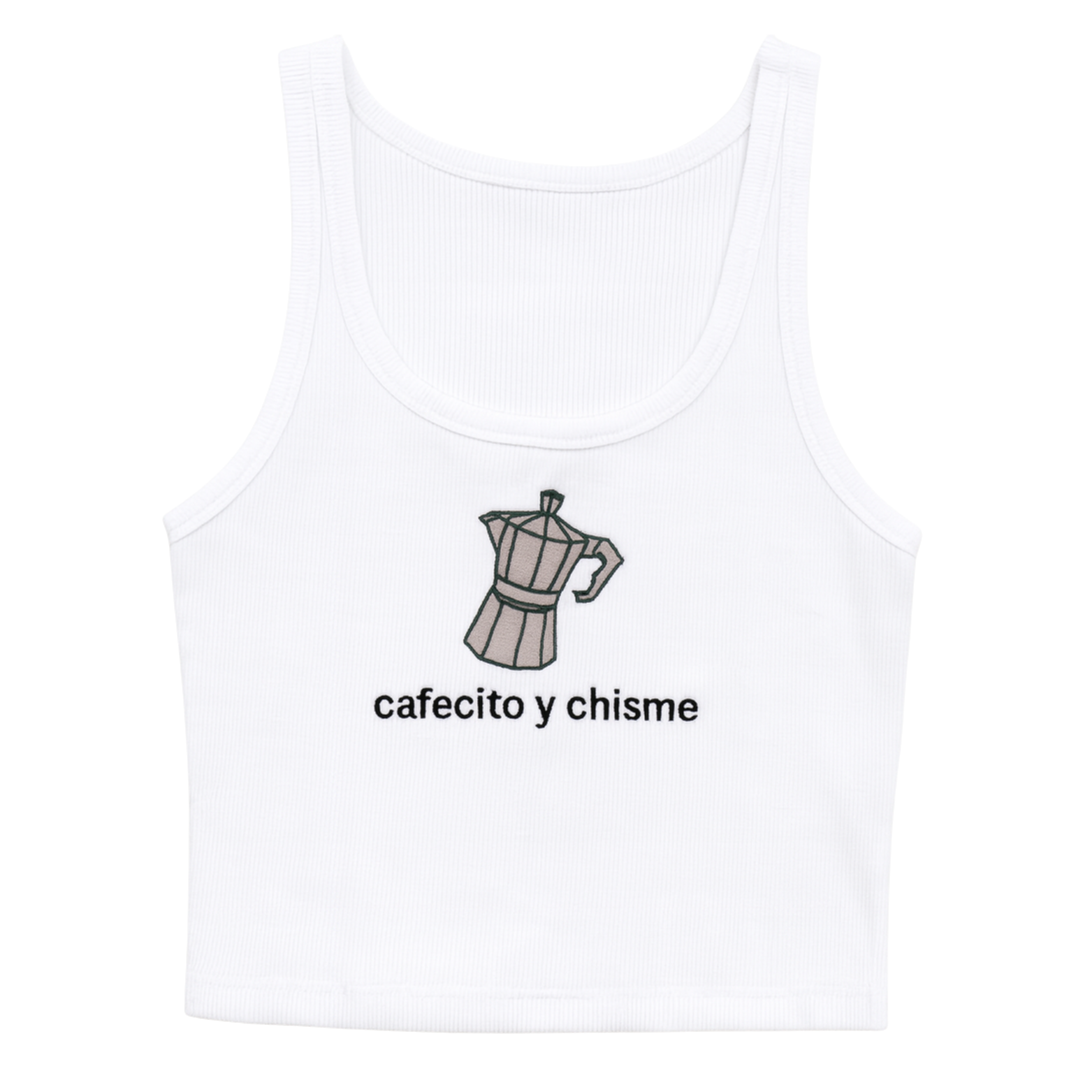 Cafecito y Chisme Tank – A crisp white cropped tank with embroidered moka pot artwork and the phrase “cafecito y chisme.” Perfect for Miami mornings, late-night gossip, and everywhere in between — comfy, playful, and full of sabor.