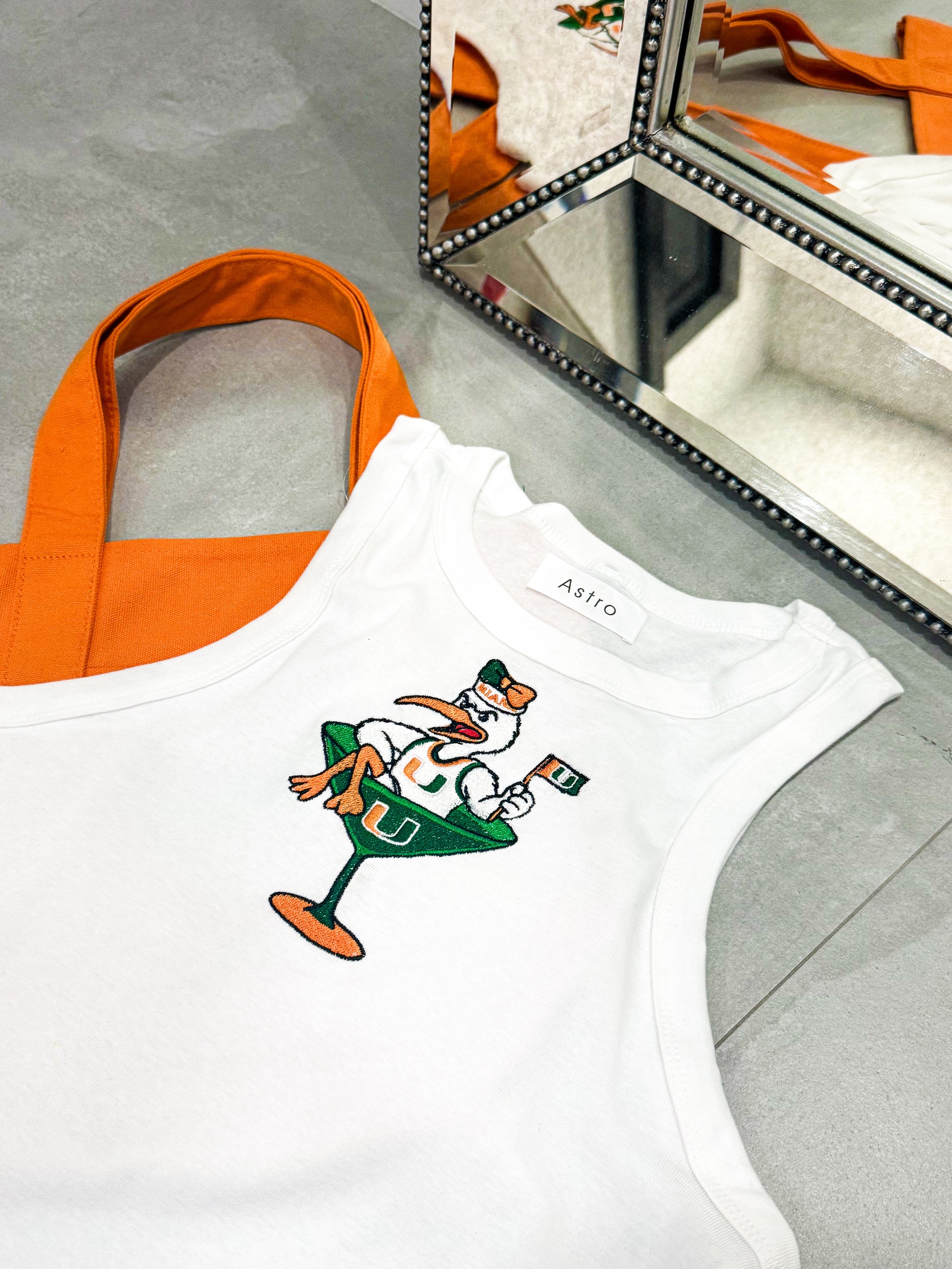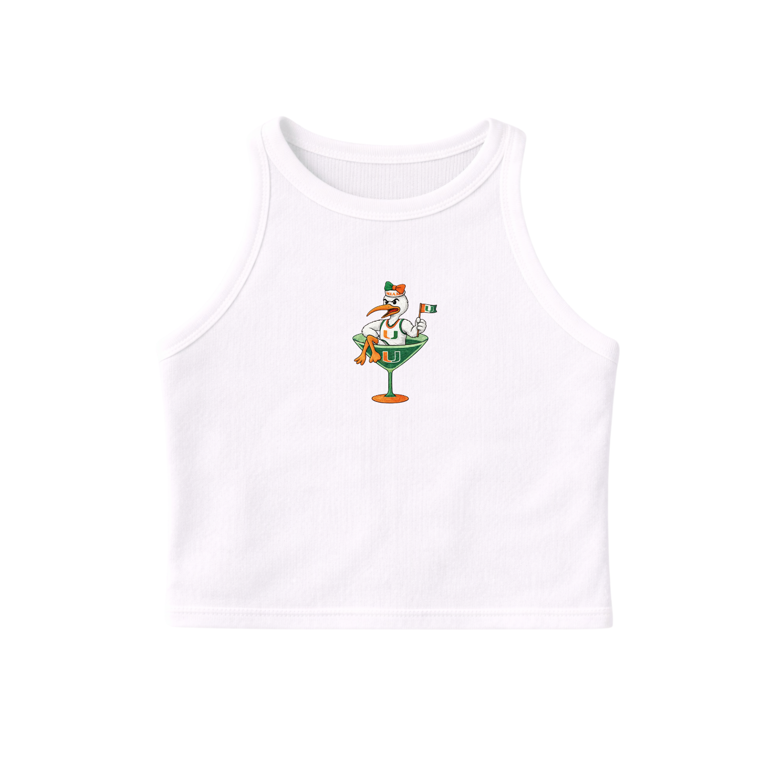 A Miami game day must. The Ibis Crop is a white, ribbed high-neck tank featuring a custom embroidered design of the iconic UM ibis perched in a martini glass. Sporty, cheeky, and made for the stands or the sandbar โ this one's for the die-hard Canes girls. ๐งก๐