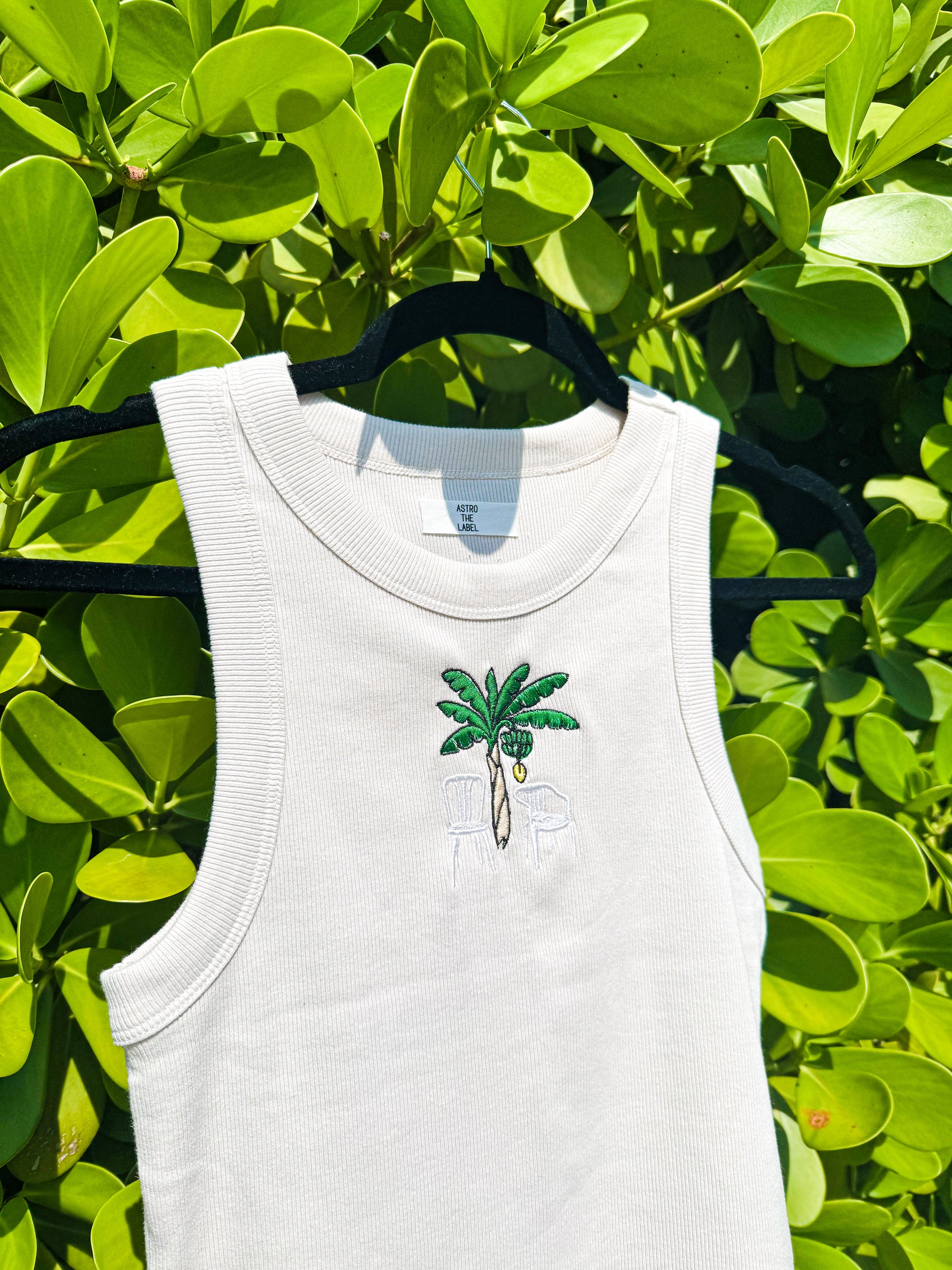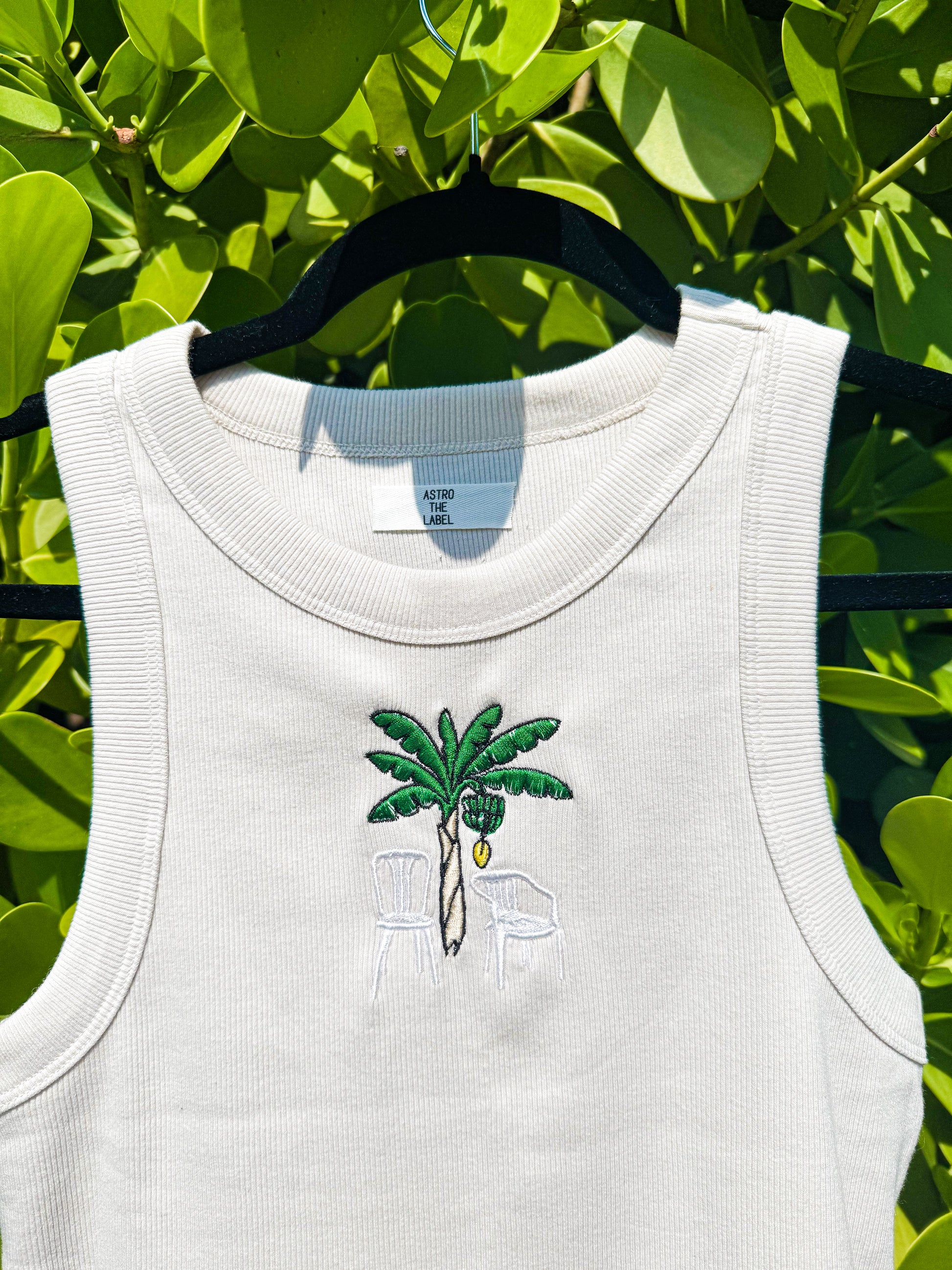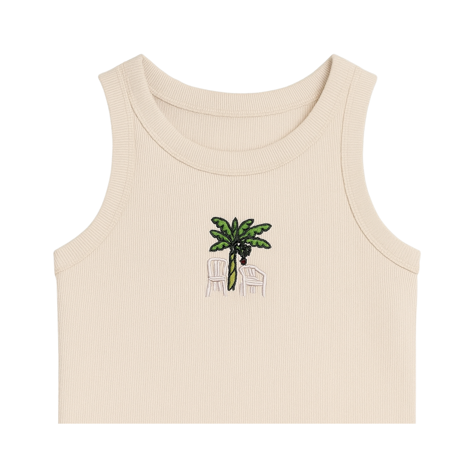 Stitched on a soft beige canvas, this tank brings the iconic palm tree and two chair moment to life 🌴 A nod to Bad Bunny’s newest album cover, Isla Para Dos is for the dreamers, the lovers, and anyone vibing under a Puerto Rican sunset. Perfect for concert nights and beachside memories.