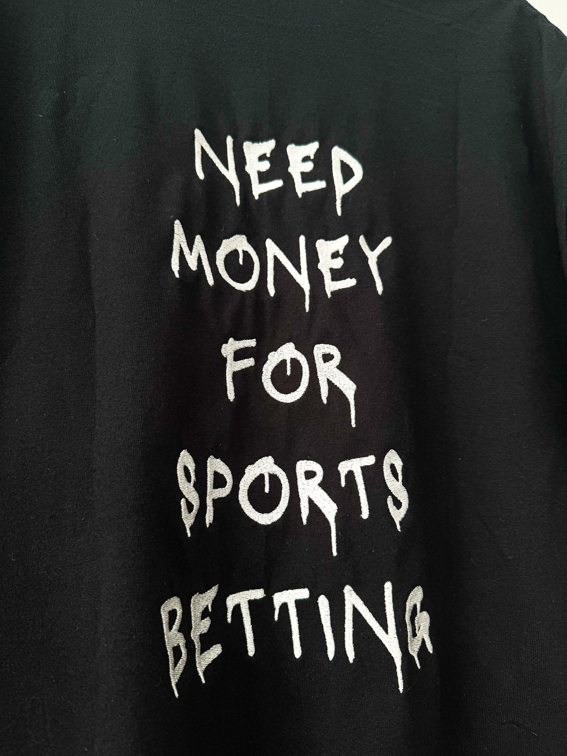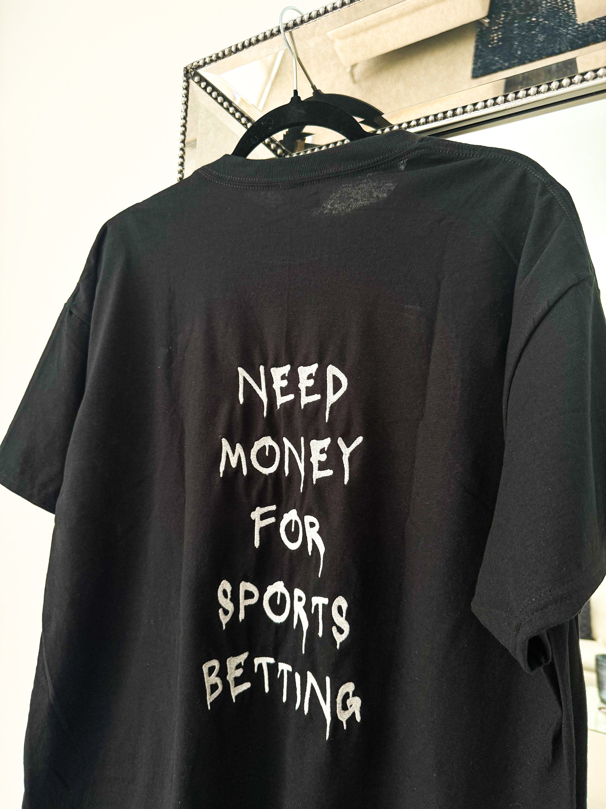 Level up your game day look with the Parlay Tee—a bold black tee for the guys who know the thrill of the bet. Featuring a back print that says “Need Money For Sports Betting” in edgy, graffiti-inspired lettering, this tee is made for risk-takers, sports fans, and anyone who lives for the parlay.