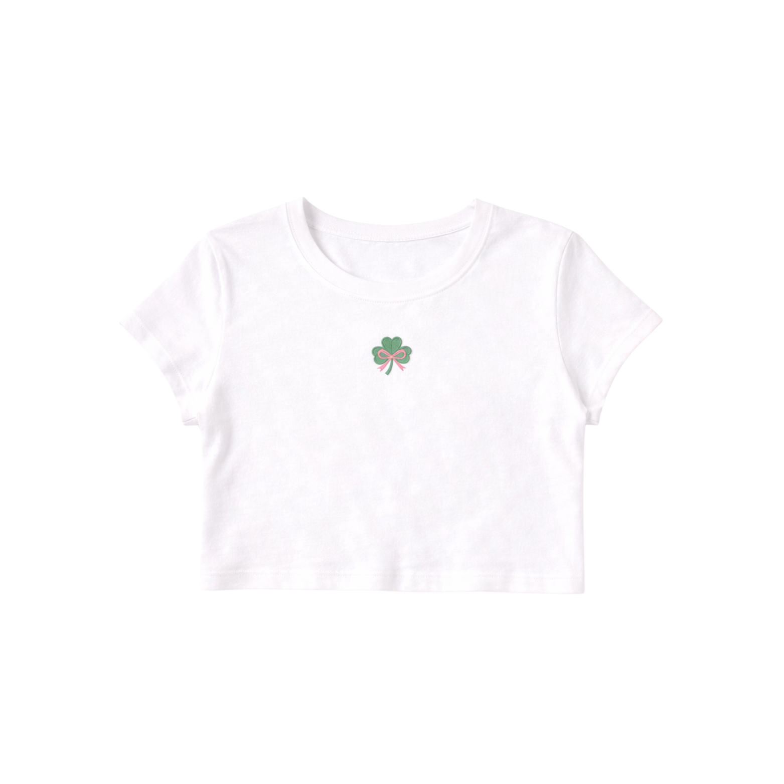The Shamrock Sweetheart Crop features a delicate embroidered shamrock finished with a soft bow detail at the center chest. Feminine and playful with just the right amount of Irish charm, this piece was made for your lucky girl era.
